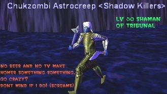 Scop... If you wanna know who is in a plane you have the same powers that I have at my fingertips. Do a /who all for the guilds. Im pretty sure at just about any time, day/night, we have at least one person on who can answer any questions you may have. Thats true for most of the guilds. No one is going to yell at you for sending them a tell to find out what they are up to... Charles... I represent Da`Kor as much as any other person in the guild. To say I dont is like saying Gerome can't speak for the Shriners or Thadew can't speak for MS. We are all part of guilds, guilds that talk amongst each other and communicate our plans to avoid little things like last night. If you have some sort of deep rooted fixation for talking smack on me, Ill be happy to meet you and discuss it. The following views are mine and mine alone. Nothing said should be viewed as a representation of Da`Kor opinion. EDIT: Didn't want to delete it completely, since your repost wouldn't make sense at the end of the thread. Hope you agree.